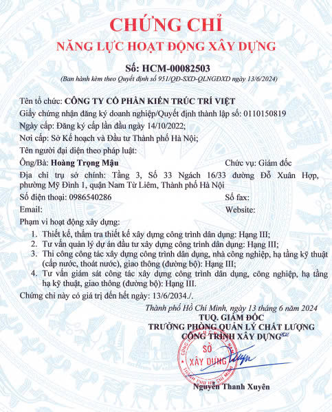 Với mục tiêu mang những sản phẩm chất lượng đến khách hàng, Công ty Cổ phần Kiến Trúc Trí Việt đã và đang không ngừng nỗ lực tạo ra một môi trường làm việc năng động, sáng tạo, bồi đắp yếu tố con người trở nên chuyên nghiệp, giàu kinh nghiệm,nhằm mang đến cho khách hàng sự hài lòng khi được khách hàng tin tưởng. Chúng tôi có đội ngũ Kiến trúc sư và Kỹ sư xây dựng nhiệt tình sẽ tư vấn, hỗ trợ khách hàng và đồng hành từ giai đoạn thiết kế đến khi hoàn thành công trình